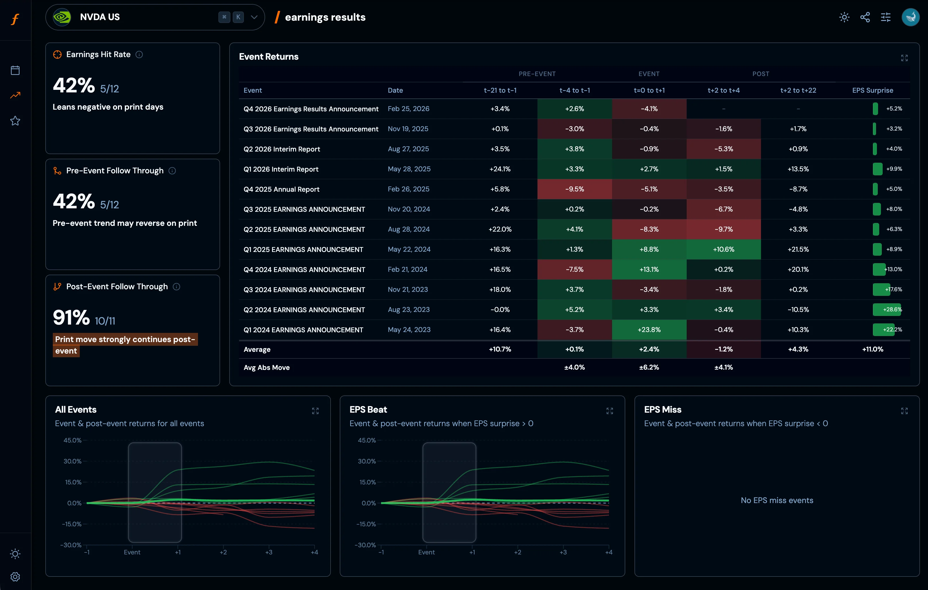 Historical EPS, earnings returns, and price reaction patterns for every company.